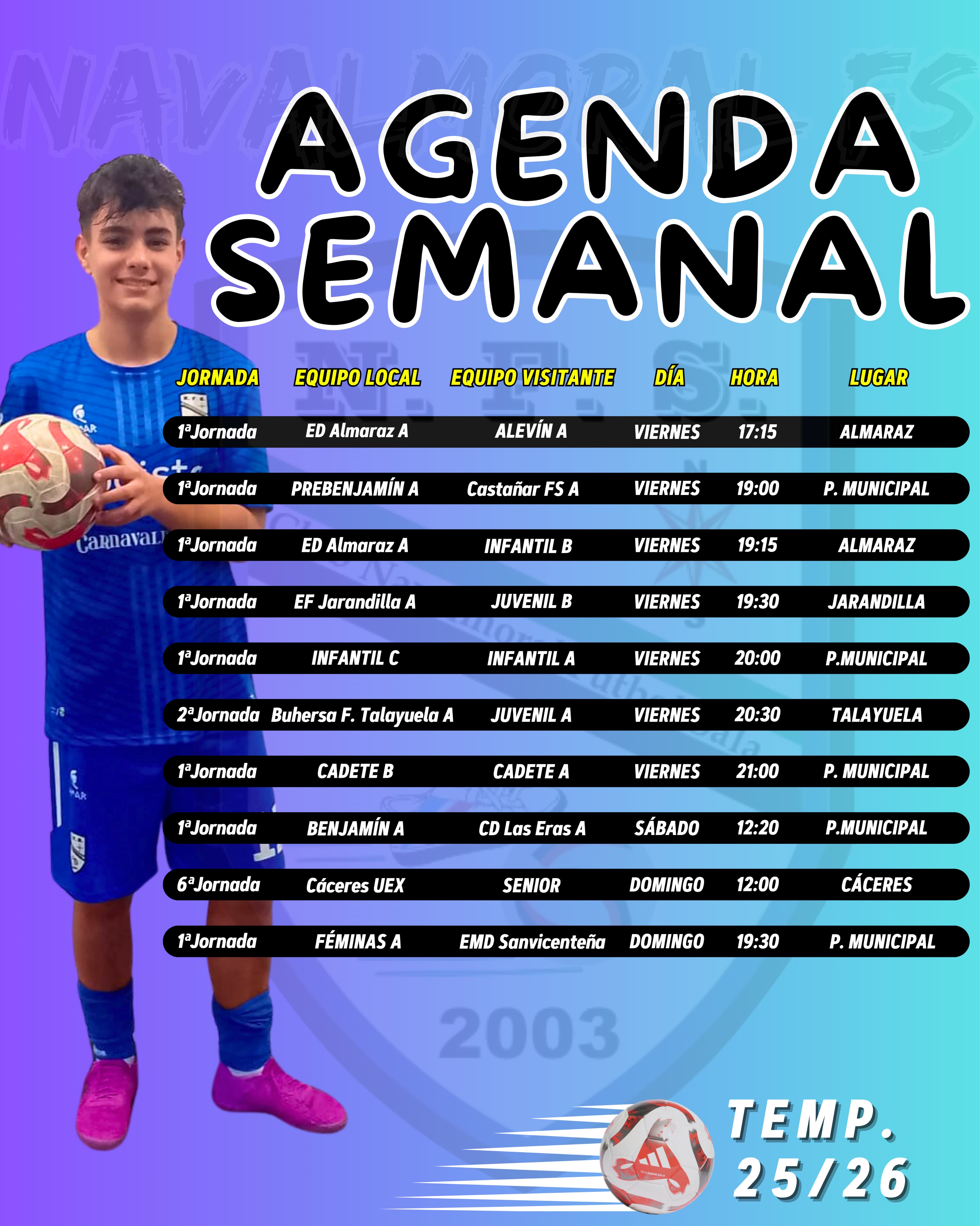 BUHERSA FYERPA TALAYUELA FS “A” - FEX MULTISEGUROS NFS JUVENIL “A”: Plato fuerte en Juveniles, tras la primera jornada y el parón llega la segunda jornada con un auténtico partidazo. Viajamos a Talayuela con la intención de sumar la segunda victoria y seguir en los puestos de arriba, no lo tendremos nada fácil ya que enfrente estará uno de los favoritos de la categoría, un Buhersa con varios ex jugadores nuestros y que ha montado un buen equipo para intentar aspirar a más este año. Bonito partido en nuestra primera salida de la temporada.