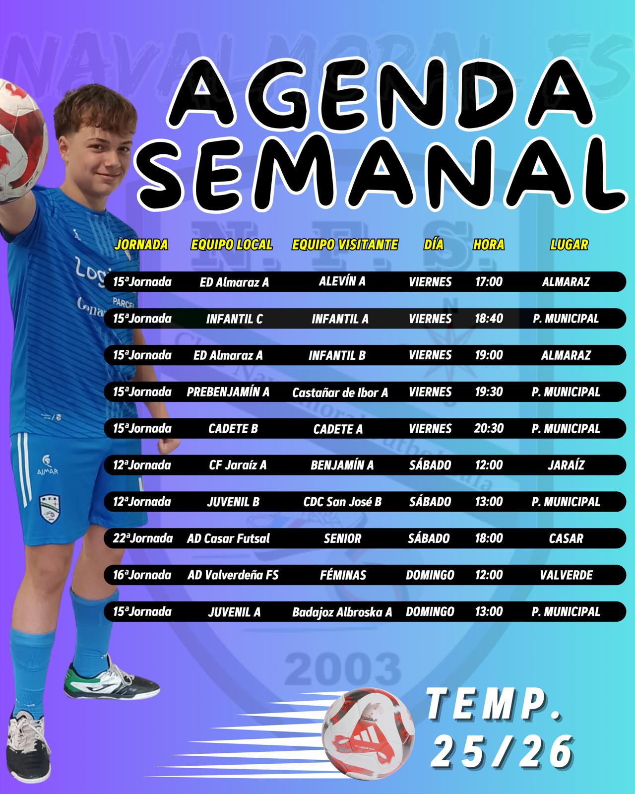 ED ALMARAZ “A” - FEX MULTISEGUROS NFS ALEVÍN “A”: 3º contra 5º. Buen partido en la categoría Alevín. Almaraz y Navalmoral se ven las caras en Almaraz en un partido que siempre promete emociones fuertes. Los nuestros tras ganar la semana pasada buscaran otra victoria importante para colocarse en los puestos de arriba, mientras los locales quieren distanciarnos en la clasificación.