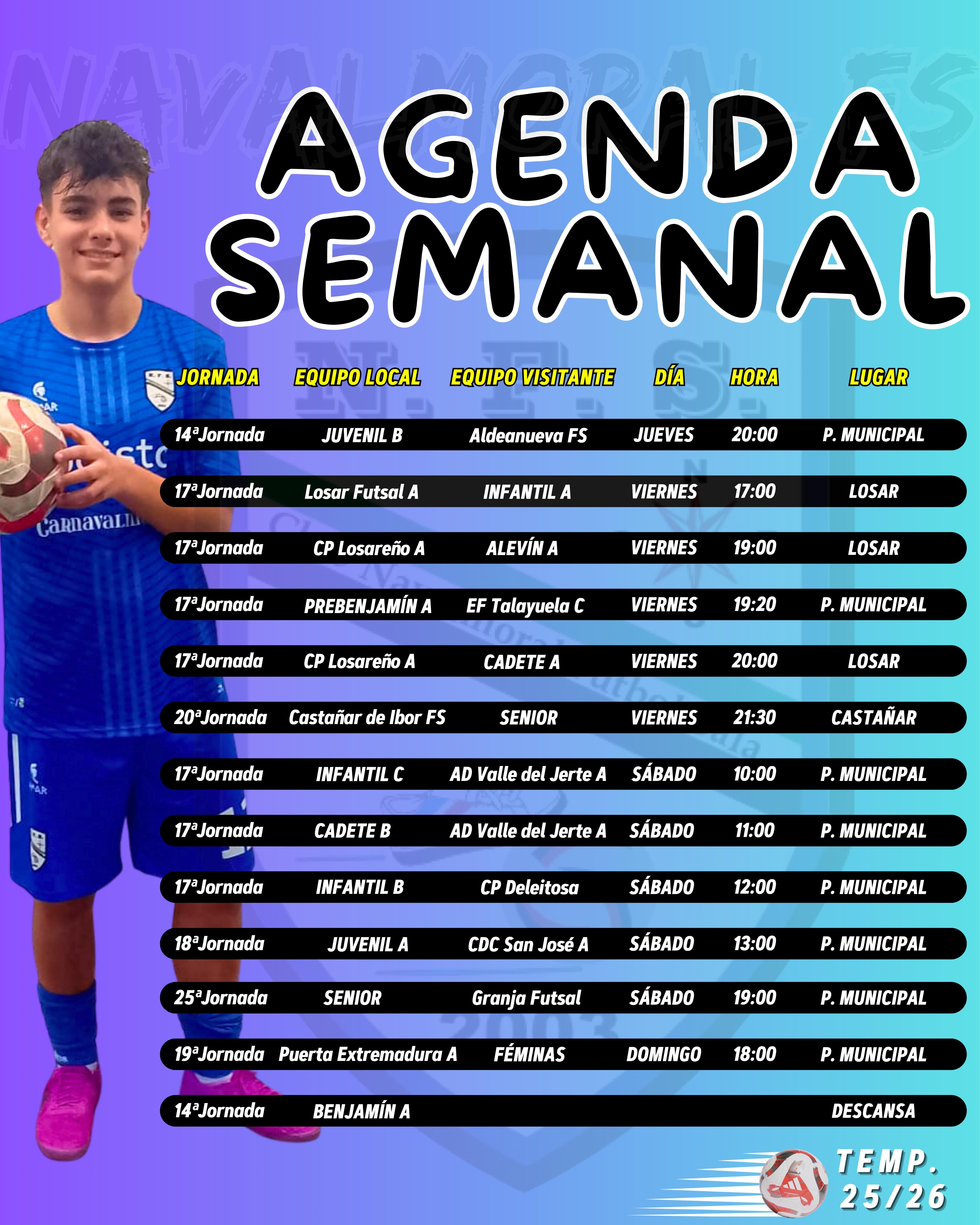 CP LOSAREÑO “A” - FEX MULTISEGUROS NFS ALEVÍN “A”: 7º contra 5º. Salida a Losar de la Vera para nuestros Alevines que quieren cortar la mala racha de resultados con una victoria ante un equipo siempre duro como local, un Losareño que no está haciendo una buena temporada pero que en su casa con su afición siempre da guerra. Buscamos 3 puntos de oro que nos den moral y oxígeno.