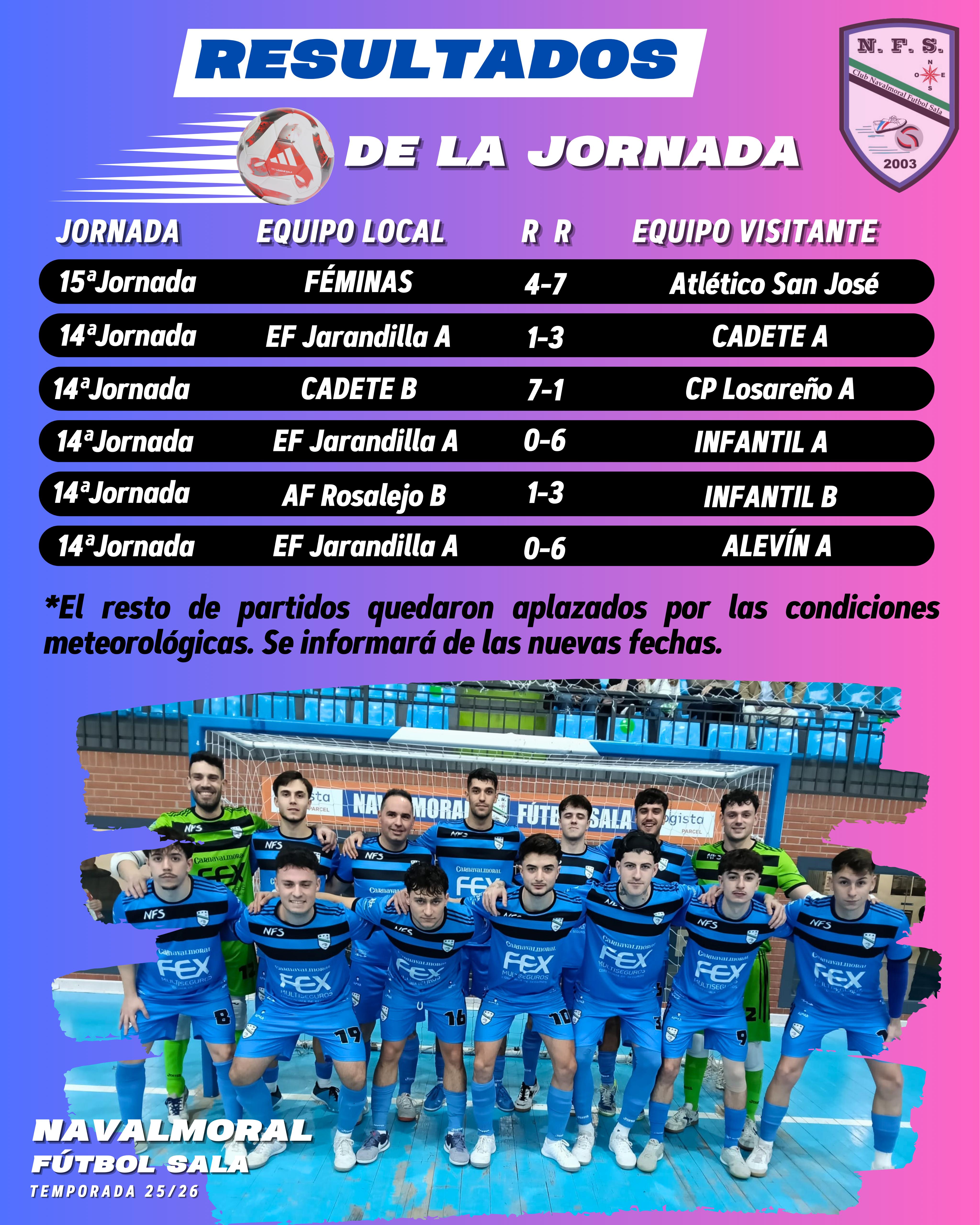 JEREZ FUTSAL “A” - FEX MULTISEGUROS NFS JUVENIL “A”: Este partido fue aplazado por el temporal. CD CRISTO DE SERRADILLA “A” - FEX MULTISEGUROS NFS JUVENIL “B”: Este partido fue aplazado por el temporal.